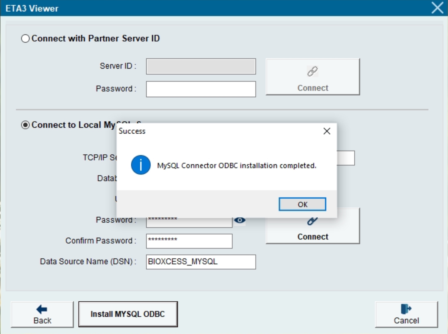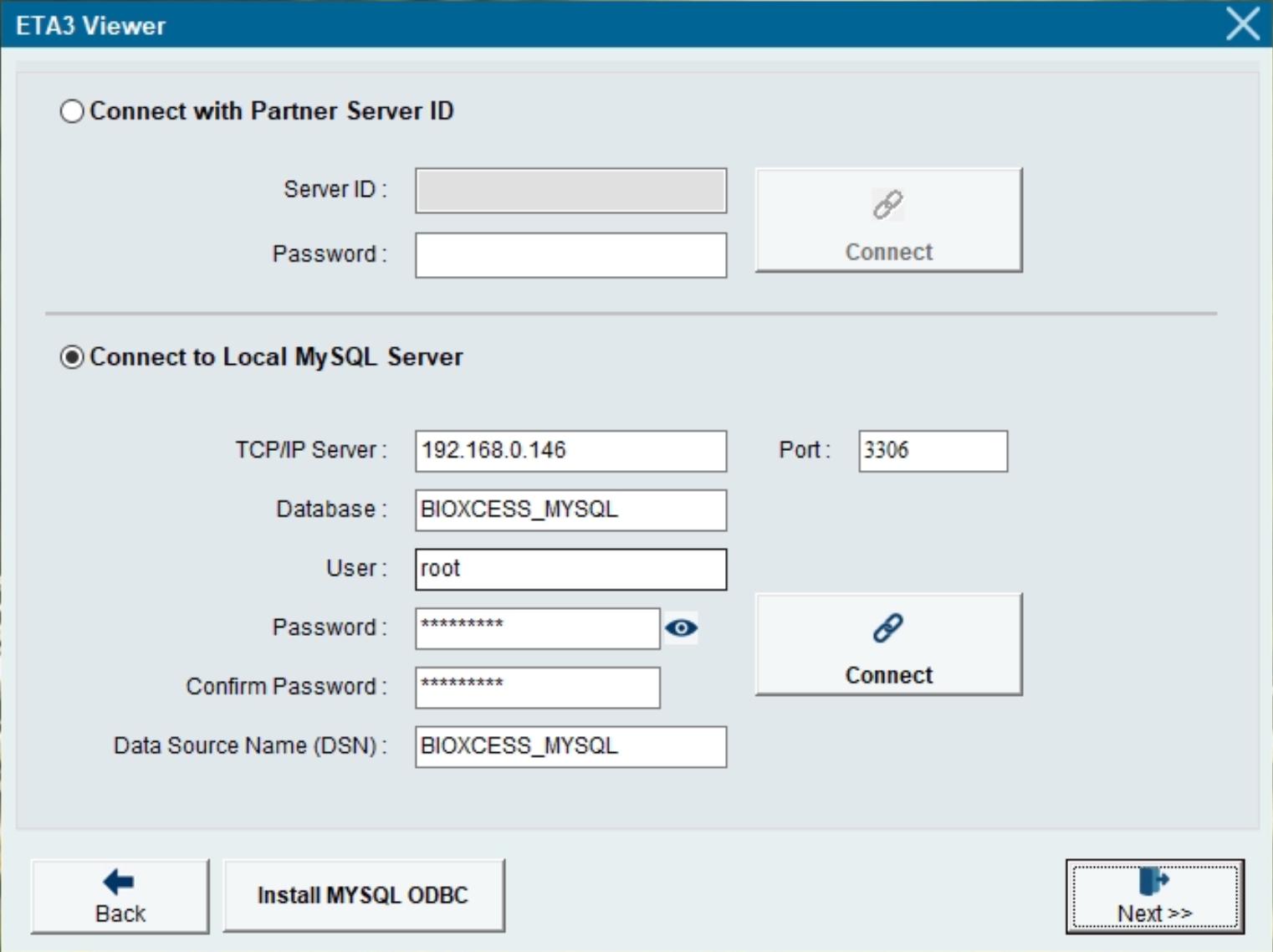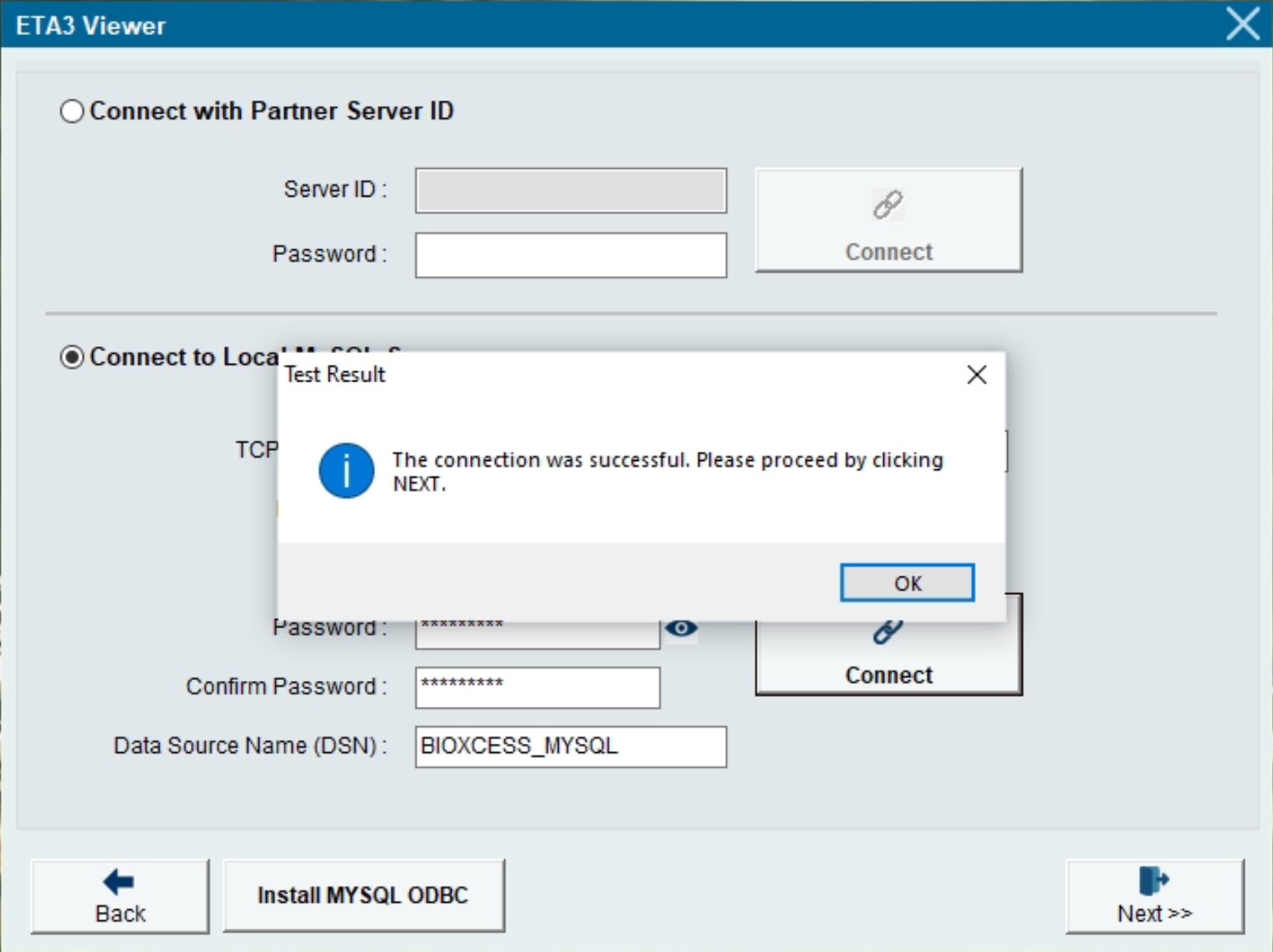 6) Enter the MySQL Database Name that you previously setup in the MySQL Server PC, eg. BIOXCESS_MYSQL