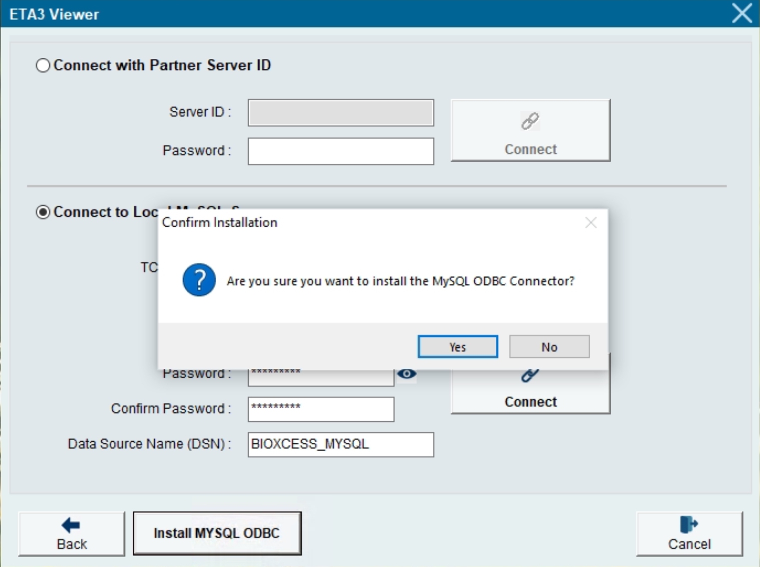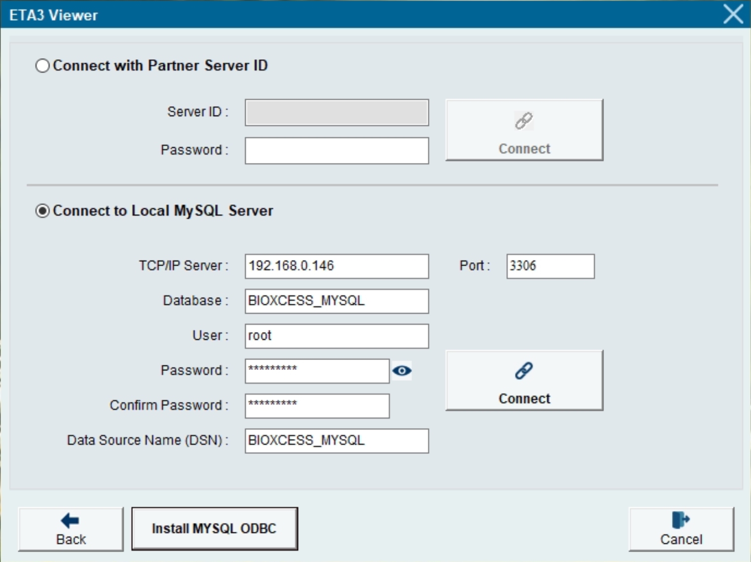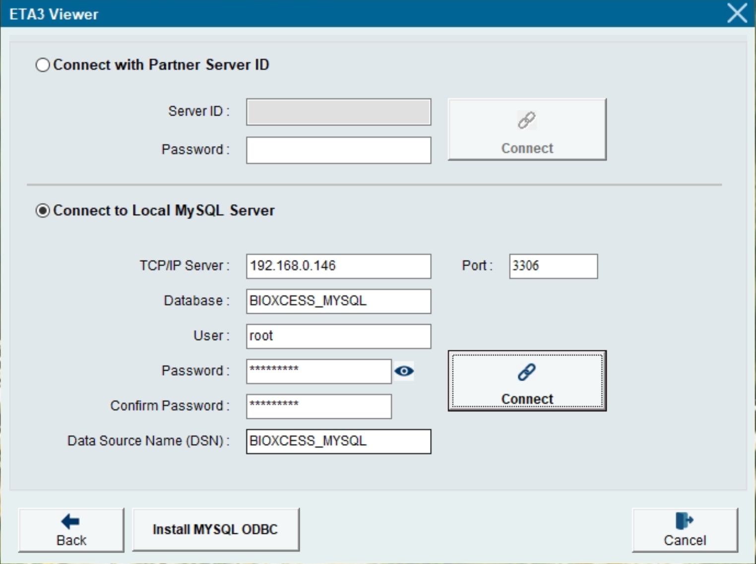 6) Enter the MySQL Database Name that you previously setup in the MySQL Server PC, eg. BIOXCESS_MYSQL
